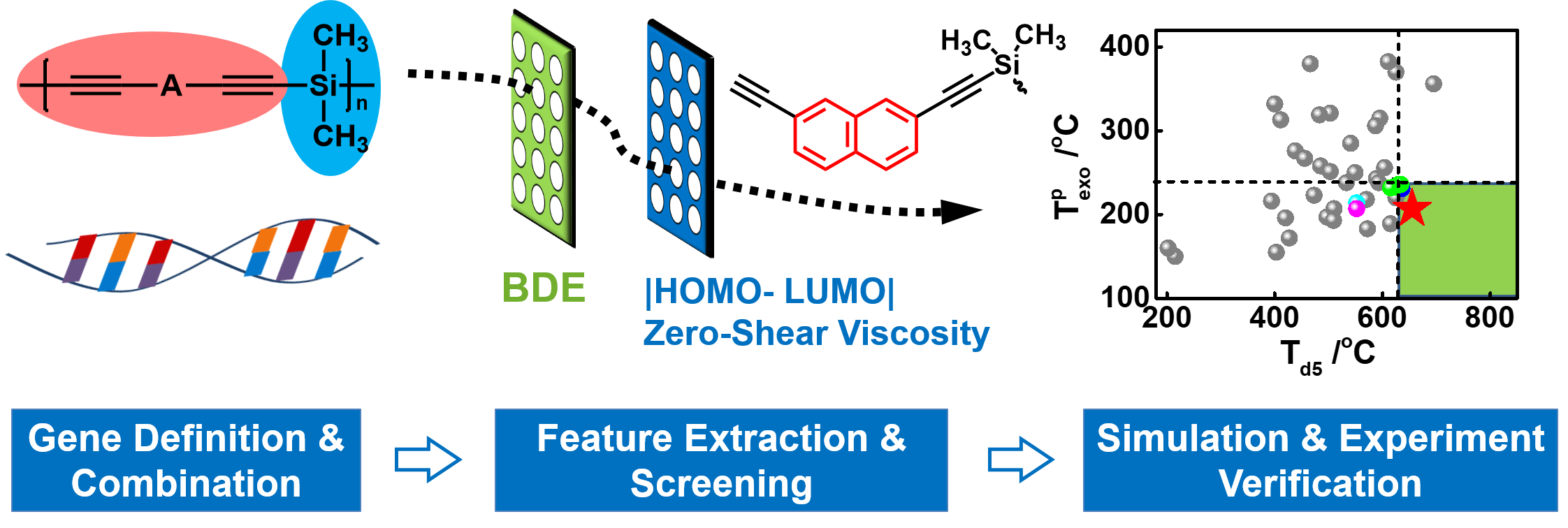 本工作发展的材料基因工程方法包含基因定义、收集与组合、性能预测、结构筛选、性能验证等步骤。1)基因定义、收集与组合。为增强合成的可行性,定义合成用化学单体为基因,并进行组合筛选。2)性能预测。性能预测是快速筛选的基础,通过数据挖掘,找到了能够代理热稳定性和固化温度的物理量,为快速筛选热稳定性好、固化温度低的树脂奠定了理论基础。3)结构筛选。提出了“先粗筛、再精选”的两步策略,即先计算低代价的代理量,通过第一步的筛选,减少候选树脂的数量,然后通过高代价代理量的计算,从中找出优选树脂,提高了筛选效率。4)性能验证。通过以上步骤,成功设计获得了一种新型耐高温树脂,其5 %热分解温度大于650 ℃、固化温度小于250 ℃, 有望在600 ℃下短期使用并满足航天航空领域对耐高温树脂的需求。