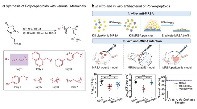 本研究中,刘润辉教授课题组通过N-取代N-羧酸酐(α-NNCA)一锅法开环聚合合成了含不同C-端官能团的抗菌类肽聚合物分子库。优选的类肽分子对MRSA浮游细菌、休眠细菌和生物膜都具有高效活性,并且连续使用聚合物刺激细菌超过八百代也未产生耐药性。优选分子在小鼠全皮层感染模型、角膜炎模型和腹膜炎系统感染模型中均显示出有效的体内抗MRSA感染效果。此外,该优选分子对多种其他耐药阳性菌同样具有体内外高效抗菌活性。该研究展示了模拟宿主防御肽的类肽聚合物在治疗耐药微生物感染和减轻抗生素耐药性研究和应用的潜力。