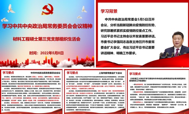 会议传达学习了中共中央政治局常务委员会会议精神、上海市委常委会扩大会议精神和校党委常委会会议精神。储明宇在领学时介绍了本次会议召开的背景,结合党支部实际,号召支部全体党员当好宣讲员、当好示范者、当好贴心人。支部党员朱贝贝、宋路路、丁新煜结合自身实际作了交流发言,他们表示要严守疫情防控红线,敢于亮身份、做表率,积极发挥党员先锋模范作用,保持积极心态,关心同学身心健康,做温暖传递员。大学生做爱
