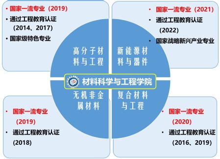 的“高分子材料与工程”专业和“ 无机非金属材料”专业首批被认定为国家一流本科专业;2020年,“复合材料与工程”专业在第二批次被认定为国家一流本科专业;2021年,“新能源材料与器件专业”于第三批次入选国家一流本科专业。