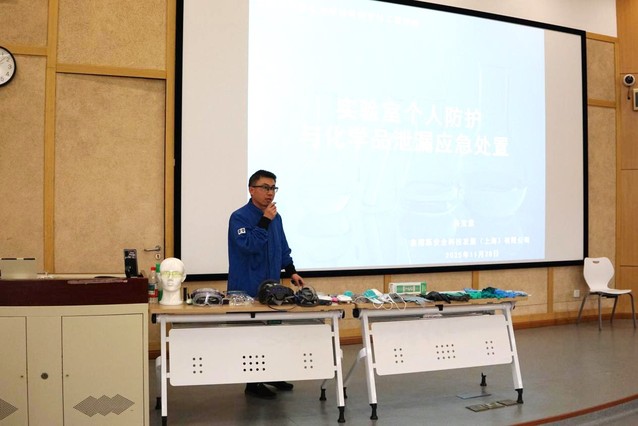 培训以“防护知识+实操演练”形式展开。理论环节,马宝意结合真实事故案例与实物演示,系统讲解呼吸、眼面部、手部、身体防护用品的功能差异、选配要点及正确使用方法,强调“无万能防护装备”原则;同时覆盖危险化学品分类、应急救援物资、喷淋及洗眼器规范使用等核心安全知识。化学品泄漏应急处置部分,马宝意介绍吸附棉、中和剂等应急物资的使用要点,明确“自身安全优先”的处置准则,并以硫酸泄漏为模拟场景开展示范性演练——指导师生正确穿戴化学防护服、全面具、防护靴、手套等防护装备,依次完成泄漏区域安全评估、吸附清理及废弃物处理的全流程操作。