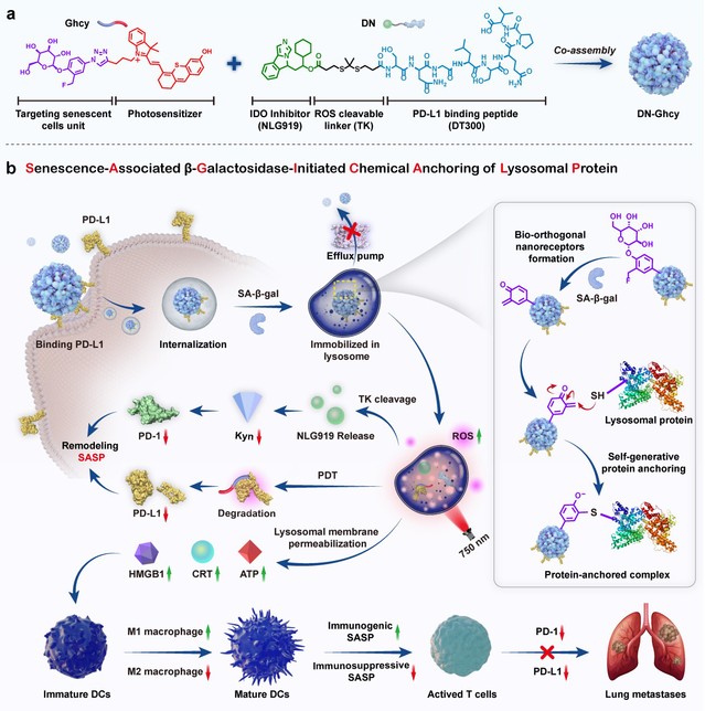 研究人员构建了一种兼具衰老与肿瘤双重靶向性的免疫治疗自组装药物(DN-Ghcy)。该药物由一个可被衰老相关β-半乳糖苷酶激活的生物正交受体(Ghcy)和一个工程化免疫刺激前药(DN)两亲性自组装构建。在衰老肿瘤细胞内,DN-Ghcy通过衰老相关β-半乳糖苷酶催化的生物正交纳米受体作用实现原位固定,从而显著增强药物在细胞内的滞留,绕过转运蛋白介导的药物外排。在近红外光照射下,DN-Ghcy可同时介导PD-L1降解、IDO抑制剂释放并破坏溶酶体完整性。该策略成功逆转了衰老肿瘤的免疫治疗耐药性,为克服由衰老驱动的免疫治疗耐药性建立了一种极具前景的新型治疗模式。